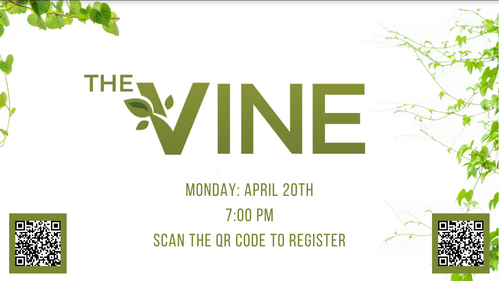Women ages 13 and up, join us for the Vine at 7pm on April 20th. Our guest speaker will be Stephanie Idland will be our guest speaker. Bring your Bible and pen! We'll see you there.